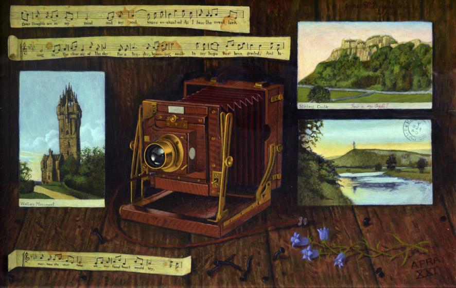 James is well – known for his trompe-l’œil paintings, where details are rendered giving a three-dimensional effect. In recent years, some of these have had a Scottish food theme, like piece ‘n’ jam, banana piece, chips on a roll, etc. The Stirling painting references Edwardian holidays in the town with the carefully depicted postcards, camera and flowers.